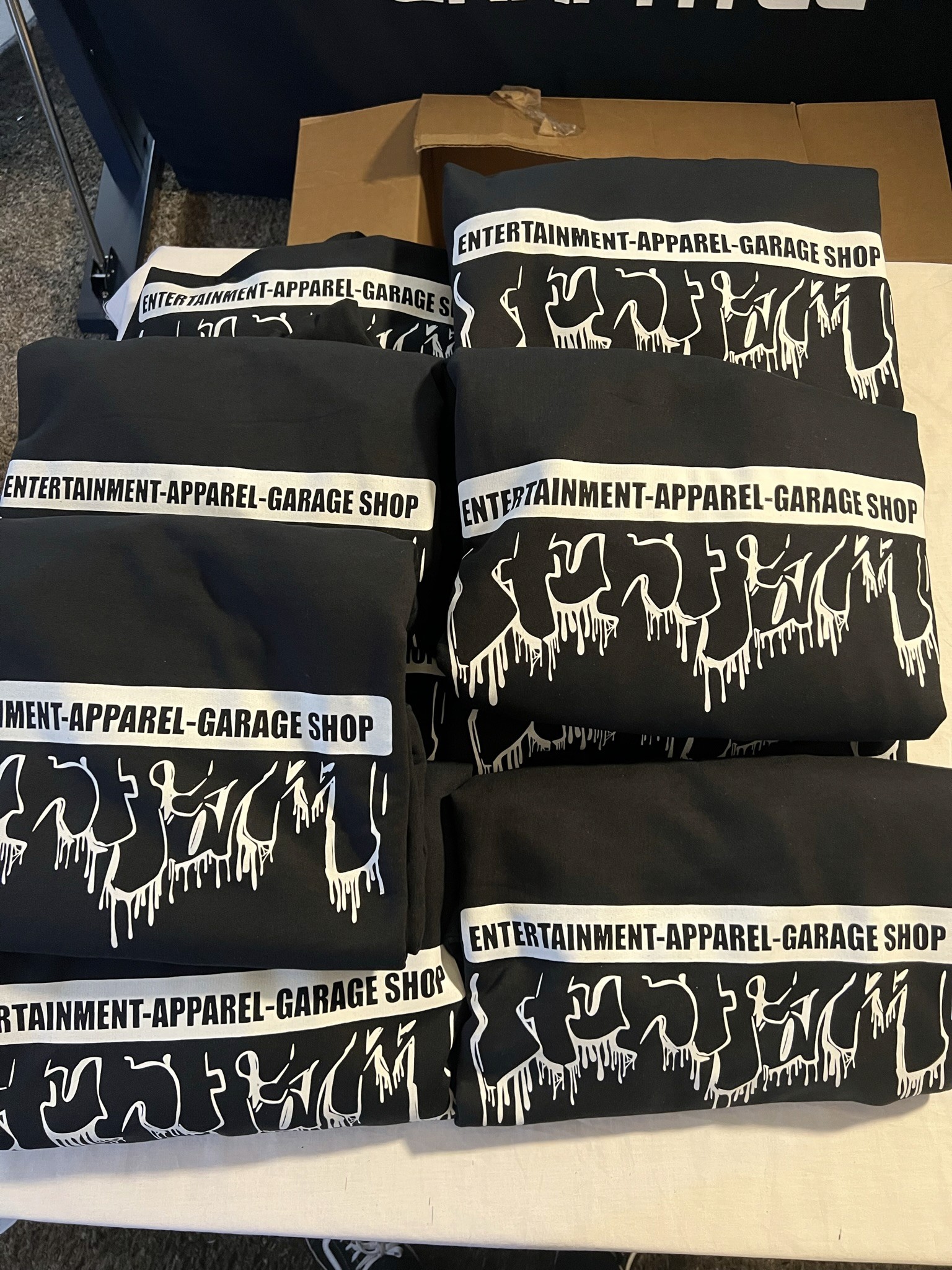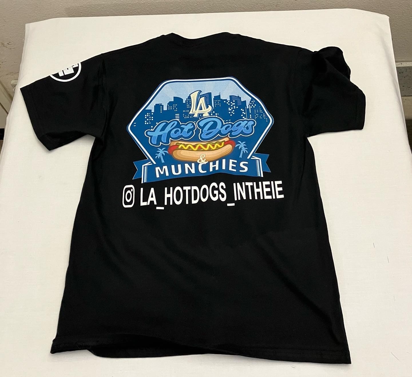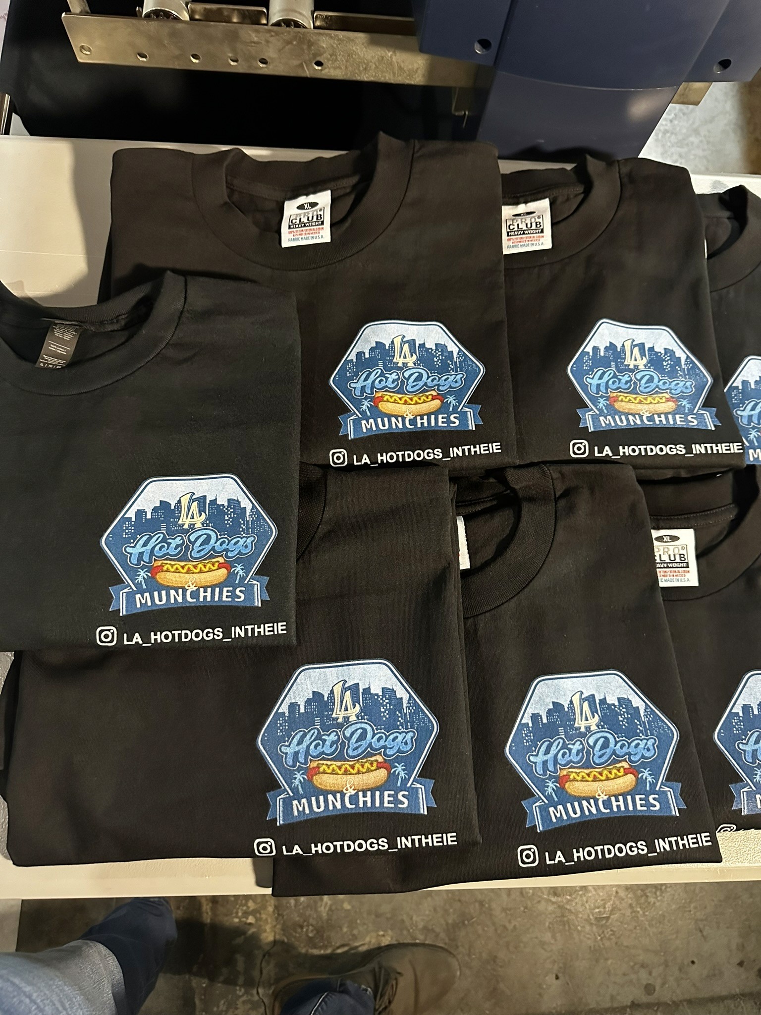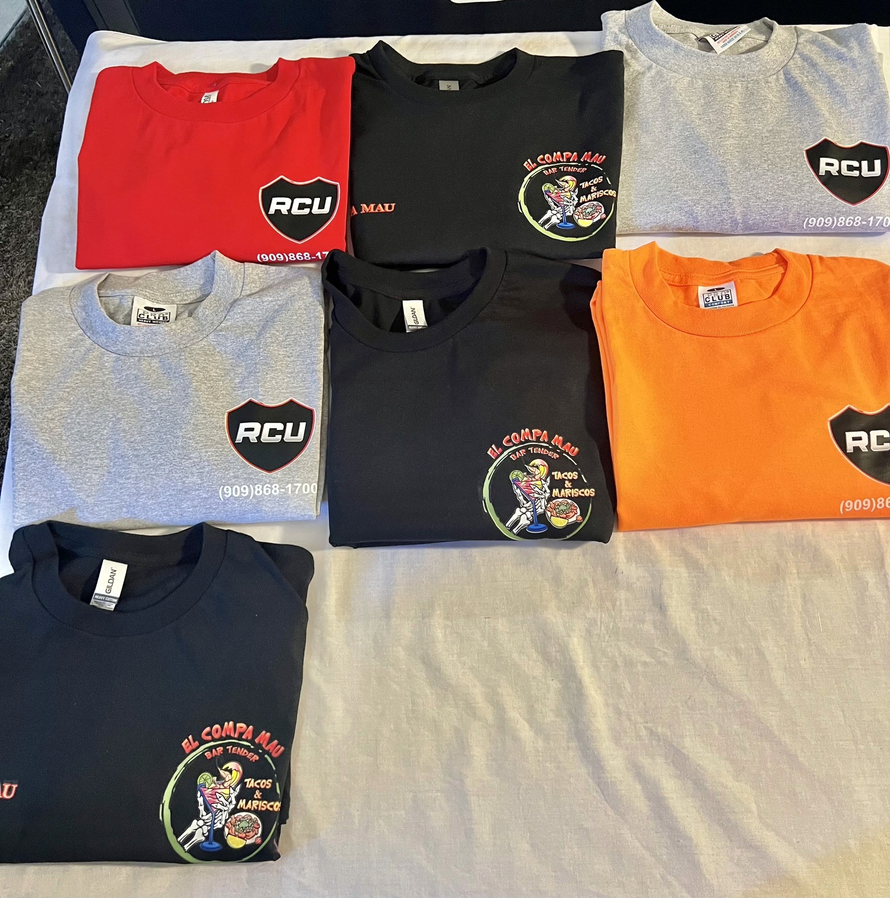 Custom staff shirts with El Compa Mau logo printed in full color.