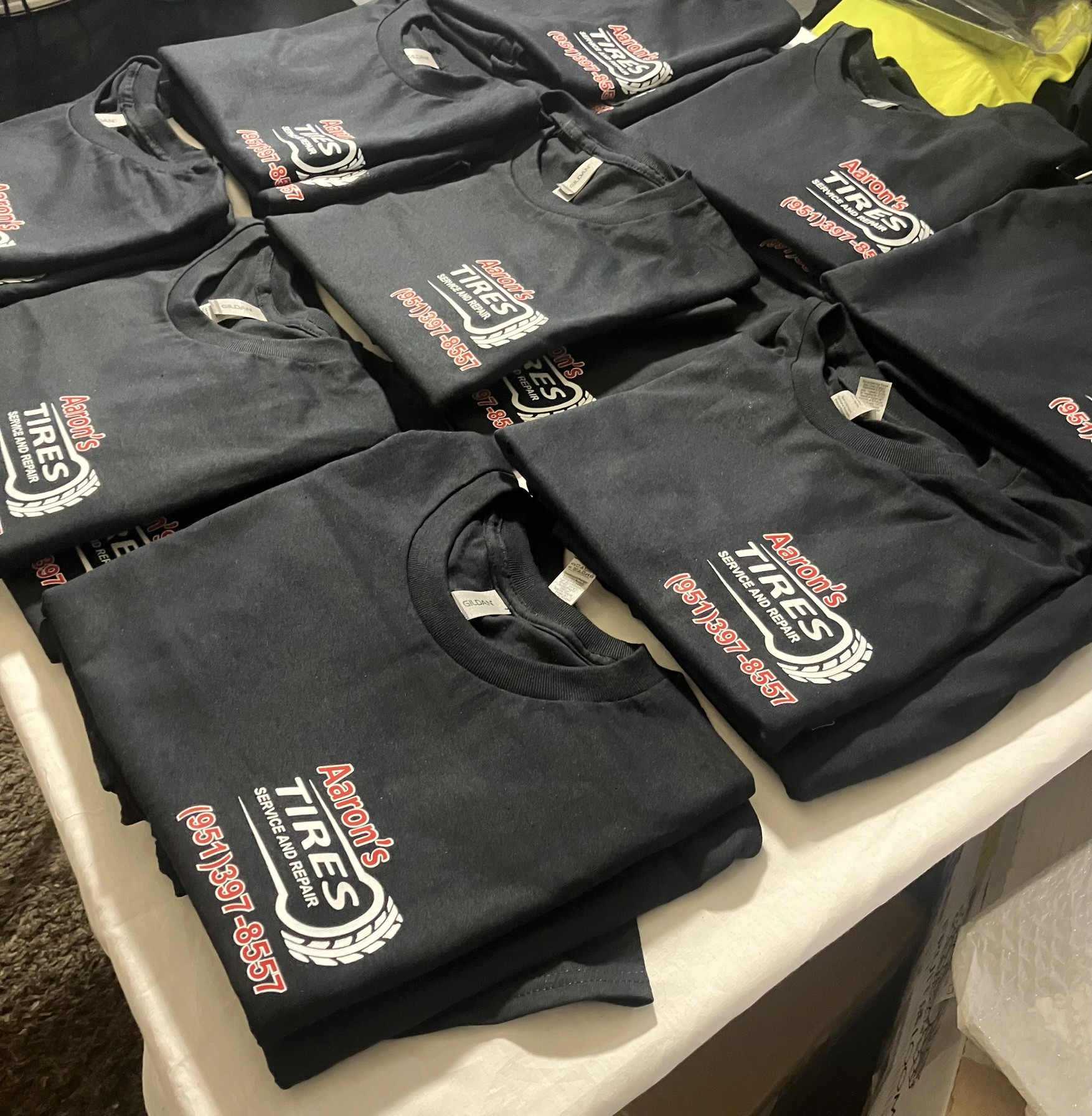 Custom staff shirts with Aaron Tires logo printed in full color.